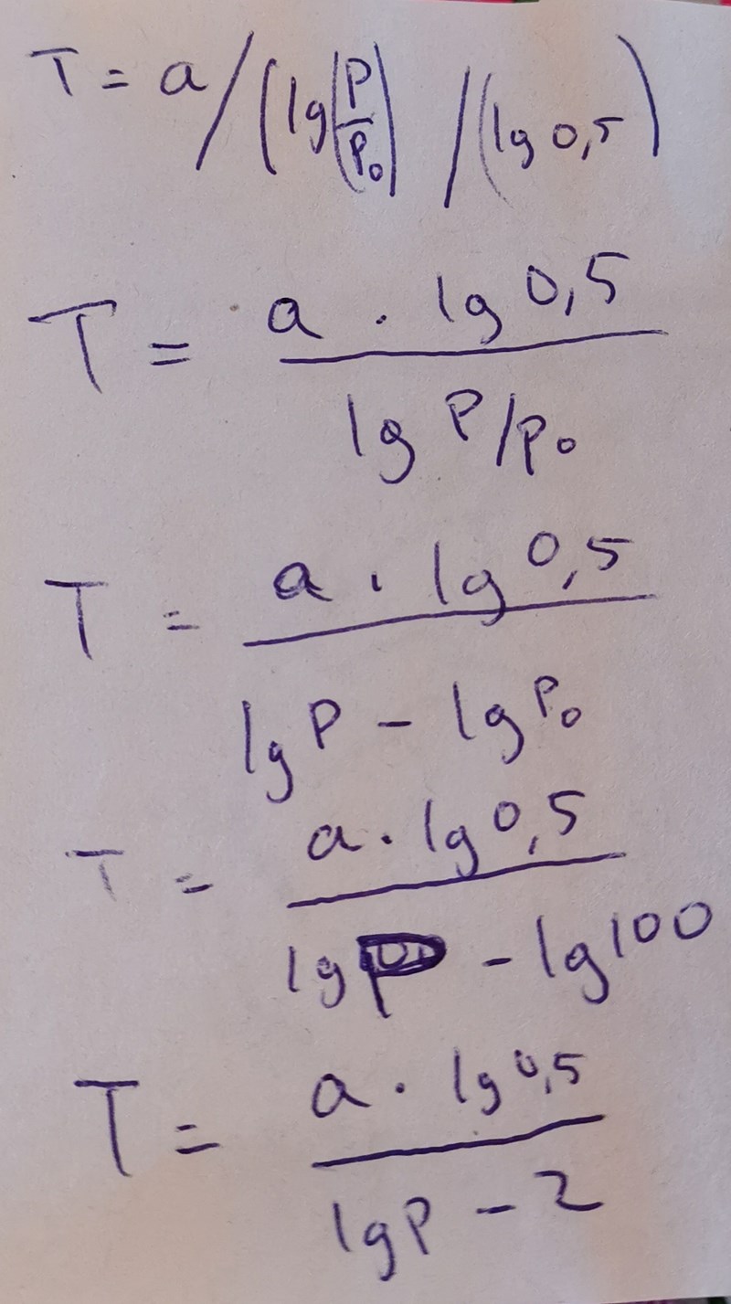 Nästan rätt och färdigt räknat. Facit har rätt. Lägg märke till att de vill ha "p" i procent (p0=100%), och förenkla lite grann ( lg(1/2) -> lg(2) ). Kontroll: