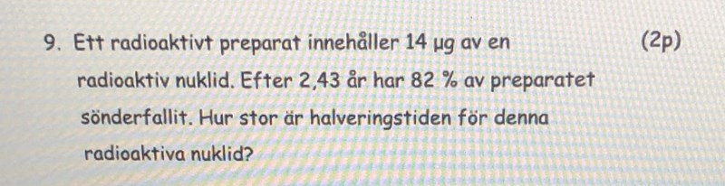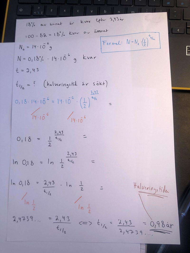 Fysik / Fysik 1 1 svar 28 visningar offan123 behöver inte mer hjälp Avmarkera offan123 3072 Postad: 17 maj 2021 18:30 Halveringstid Är detta rätt? Laguna 31798 Postad: 17 maj 2021 20:45 Ja. Användare skriver Svara Du behöver Logga in eller Bli medlem först! Avbryt