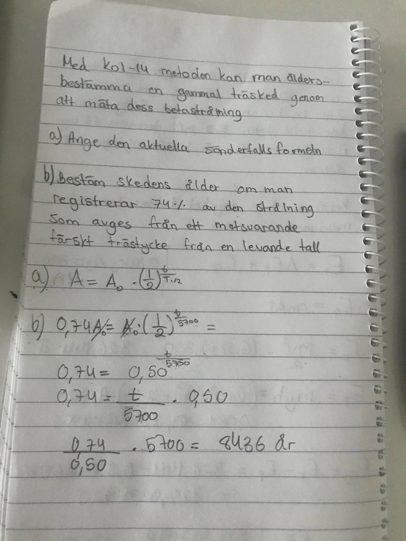 b) Bestäm skedens ålder om man registrerar 74 % av den strålning som avges från ett motsvarande färskt trästycke från en levande tall.