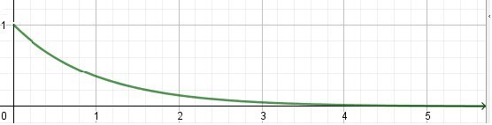 Funktionen börjar vid t=0 med funktionsvärdet 1, och minskar sedan.