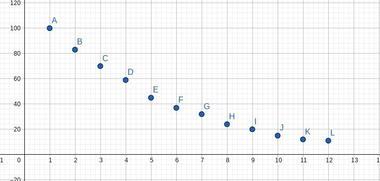 Nej, punkt A är när man har kastat 0 gånger så att alla hundra tärningarna, eller hur? När du har kastat en gång är det 82 tärningar kvar, och efter 2 kast är det 72, eller hur? (Ungefär, alltså.)