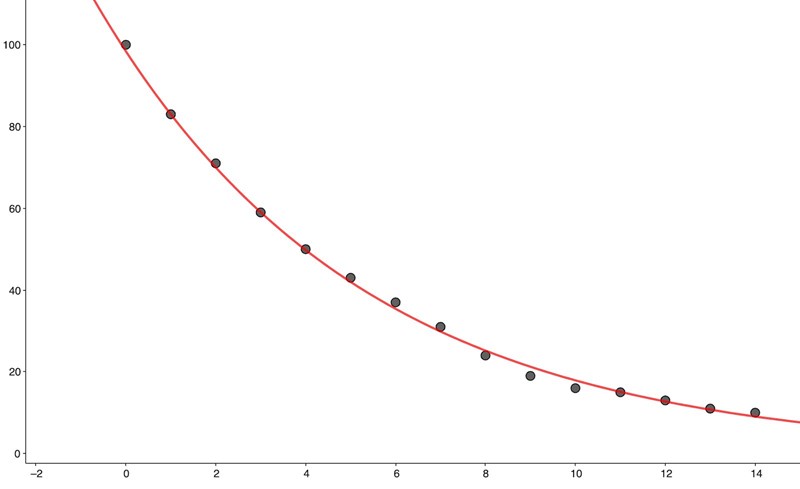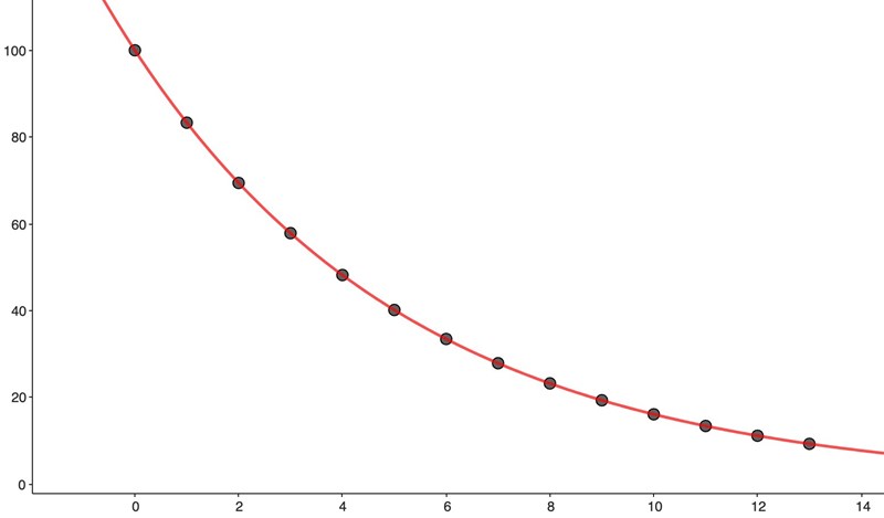 Du skulle kunna göra en teoretisk beräkning av halveringstiden också. Du vet ju hur stor sannolikhet det är att en tärning "överlever" ett kast, så där har du förändringsfaktorn. Stämmer detta med ditt uppmätta värde?