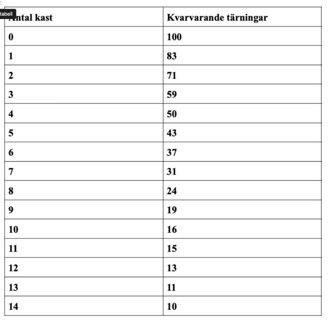 Steg C: Fortsätt tills det endast finns 10 kvar, dvs en om du använder 10 tärningar.Steg D: Rita ett diagram över antalet kvarvarande tärningar vid respektive kast. Bestäm med hjälp av diagrammet ”halveringstiden för tärningar”.