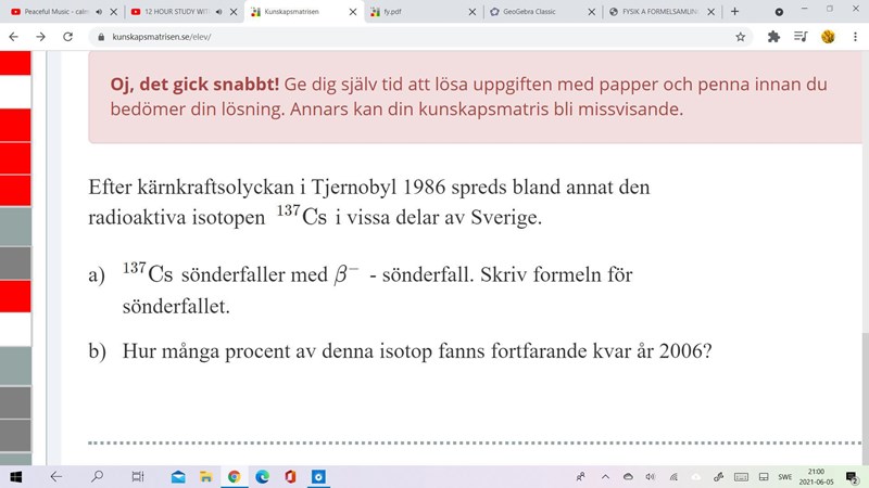 Du behöver ta reda på halveringstiden för 137Cs för att kunna lösa uppgiften.