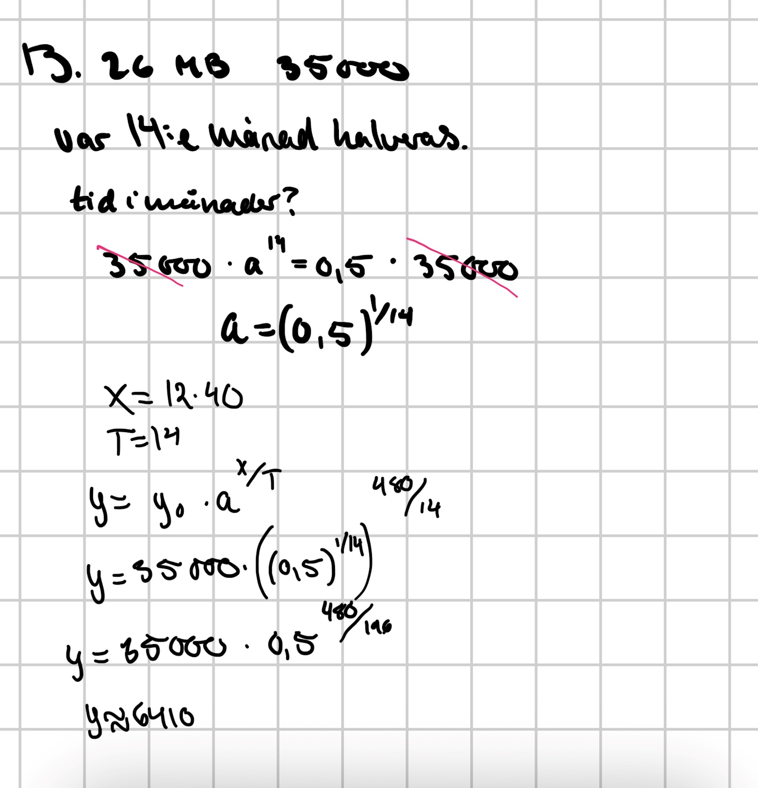 i exponenten ja. För jag tänkte att om a=0,5^(1/14) så har vi fortfarande inte fått så att säga "riktiga" exponenten i funktionen, dvs x/T där x är tiden och T är halveringstiden.