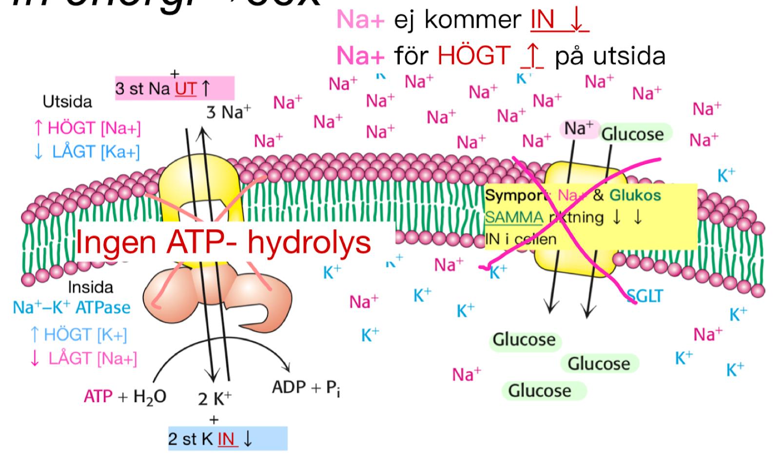 I de celler där SGLT tar upp natriumjoner tillsammans med glukos, kommer det in extra natriumjoner. Och dessa "extra" behöver pumpas ut - så det blir ytterligare arbete för pumpen.