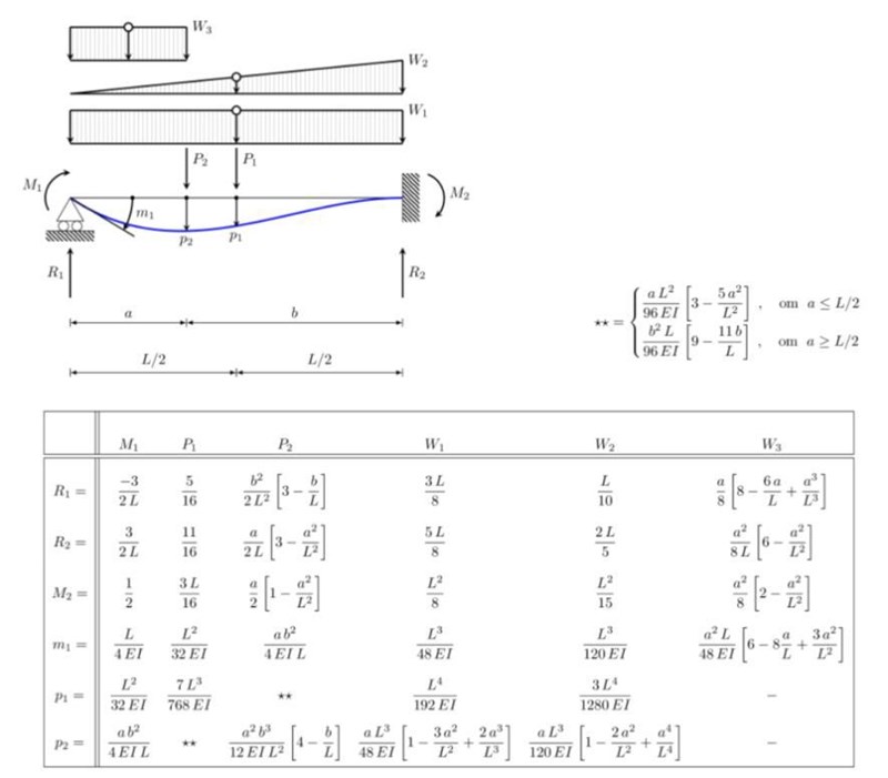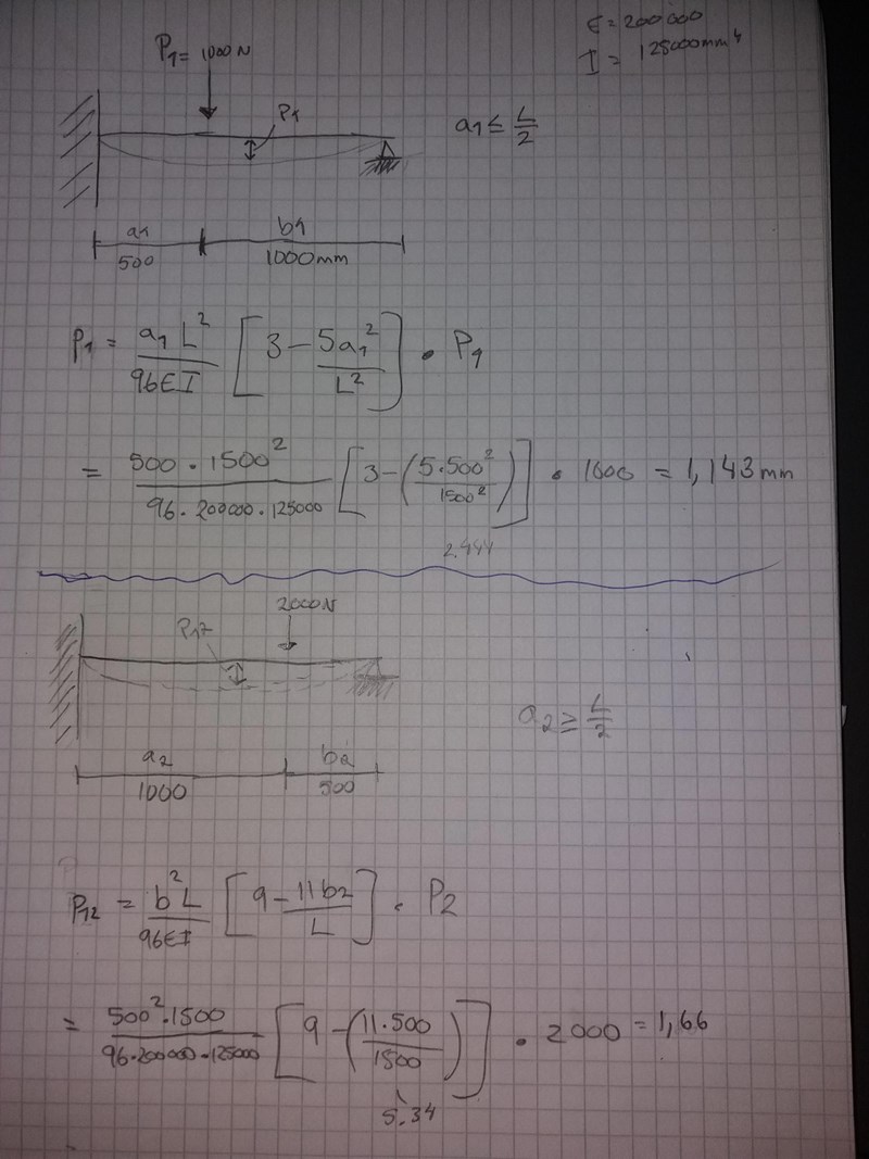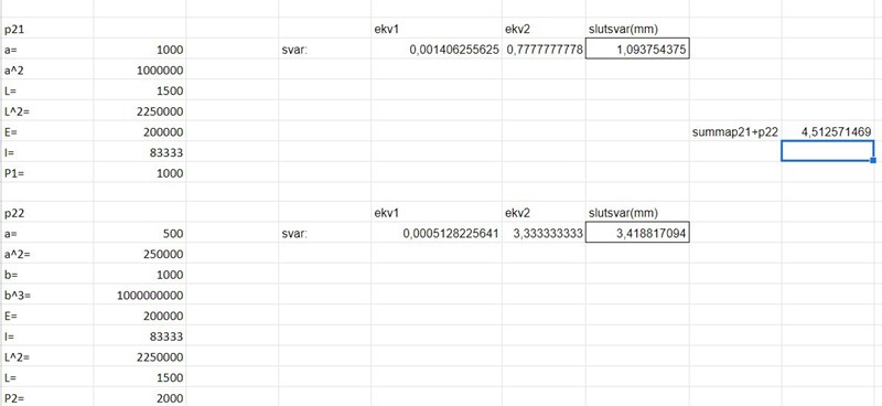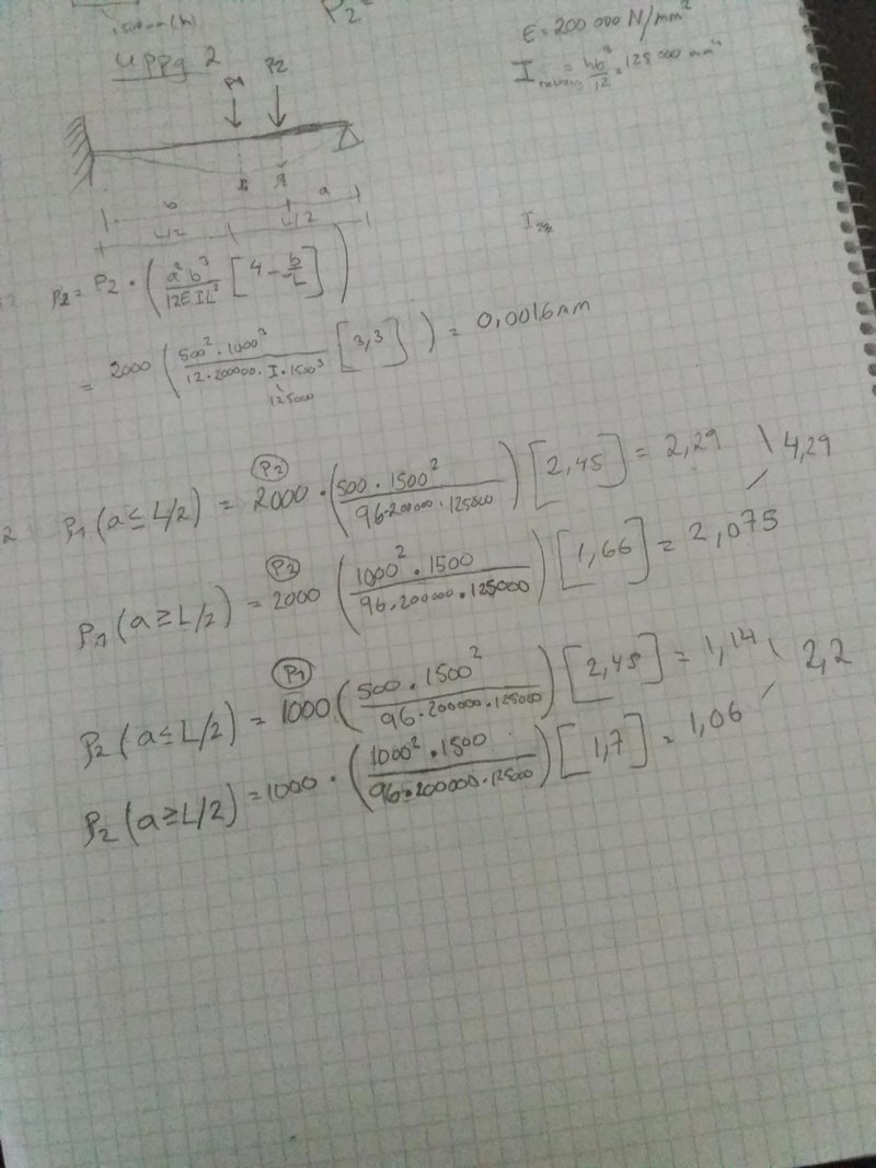 Jag har testat alla möjliga kombinationer av uträkningar från tabellen men får ändå avvikande svar. Först testade jag räkna ut bara p2  genom p2=P2* a^2b^3/12EIL^2[4-b/L] vilket get 0.0016mm.