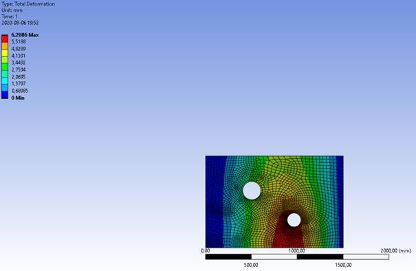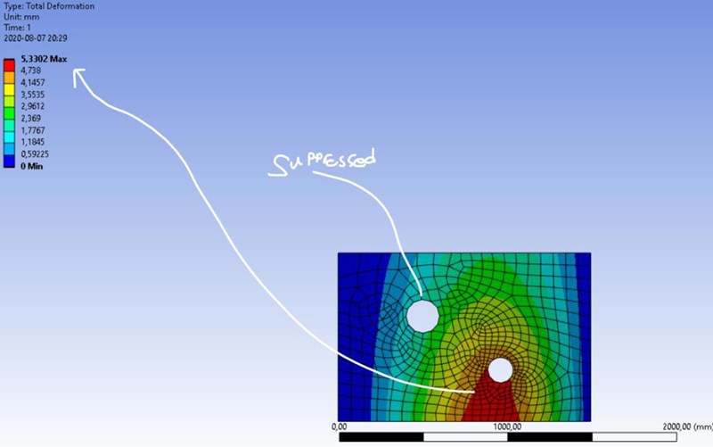 Du har sedan nedböjningen som summan av dessa två. Kontrollera även i ANSYS så att nedböjningsmaximum är vid P2P_{2}. Försök även få en generell bild av vad nedböjningens medelvärde är i ett område runt hålet, detta kan hjälpa dig jämka detta resultat med den analytiska beräkningen.