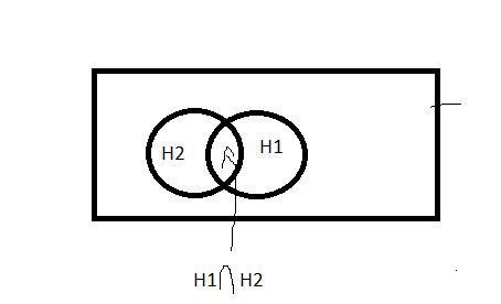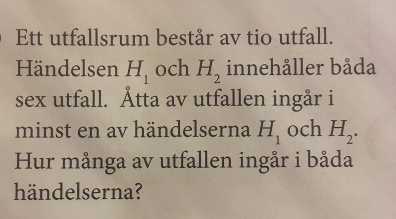 Detta är ett Venndiagram. Rektangeln är alla tio utfallen. Inne i rektangeln finns två cirklar H1 som är alla utfall som ingår i H1 och H2 som är alla utfall som ingår i H2. Emellan dem finns ett litet område där de går ihop som ibland kallas intersektionen/snittet och betecknas H1H2 som är alla händelser som ingår i H1 och H2. Det är detta område du ska ta reda på. Du vet också att de två ringarna tillsammans H1 och H2 innehåller åtta utfall totalt
