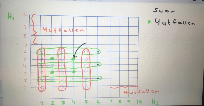 Jag var osäker själv. Gjorde utfallen. Det stod tio utfallen. Tog jag tio lodrät och horisontellt. Tog H1 sex och H2 sex. Det blir mellan de sträcken 4 st prickar utöver.