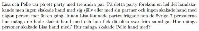 Är helt vilse, jag har kommit så pass långt att jag delat upp paren, {P,L},{1,2},{3,4},{5,6}, de skakar inte med sin partner och de skakar endast med en person 1 gång, så maximalt kan man skaka hand med 6 personer, eller så skakar man inte hand med någon alls. så de har skakat mellan , dock förstår jag inte hur jag ska kunna lista ut hur många de skakar med. Jag gissar att jag ska nyttja faktumet att man får olika svar på hur många man skakat med?