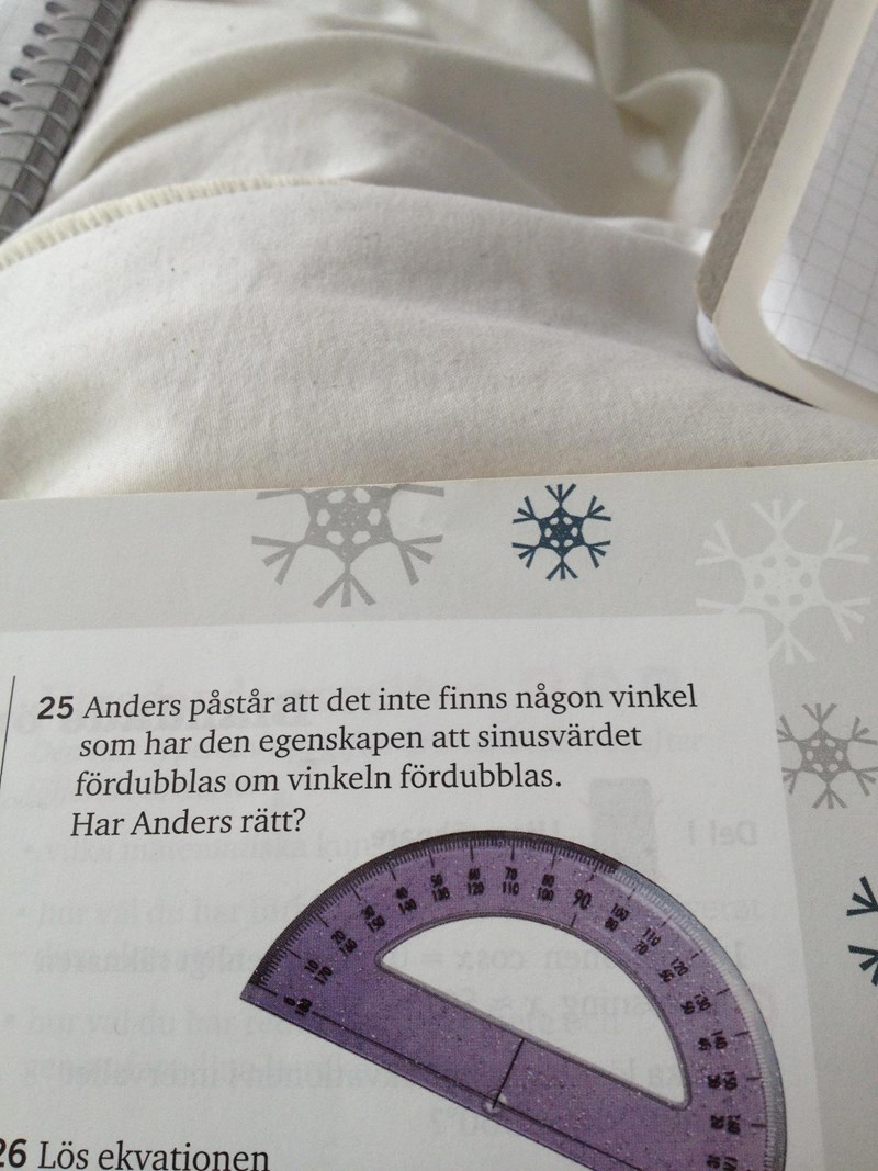 Men notera att detta är helt irrelevant egentligen, vi vet att det inte gäller att 2sin(15) = sin(30) oavsett om vi kan räkna ut vad sin(15) är eller ej. Detta eftersom vi vet att det inte är en lösning till ekvationen 2sin(x) = sin(2x).