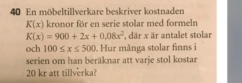 Vi har även att K(x)= 900 + 2*x + 0,08*x2. Kombinerar man våra två uttryck för K(x) så får man: