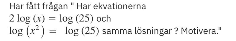 Det innebär att ekvationen lg(x2)=log(25)lg(x^2)=log(25) har de båda lösningarna x=±5x=\pm5 men att ekvationen 2·lg(x)=lg(25)2\cdot lg(x)=lg(25) endast har lösningen x=5x=5