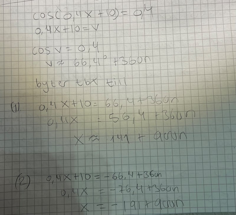 Uppgift: Har ekvationen cos(0,4x + 10 (grader))= 0,4 någon lösning i intervallet 800 < x < 1000? motivera.