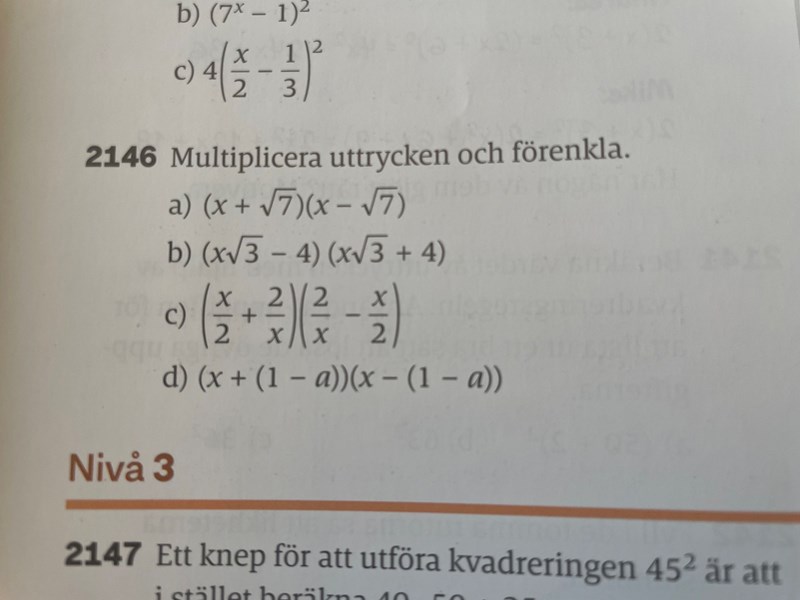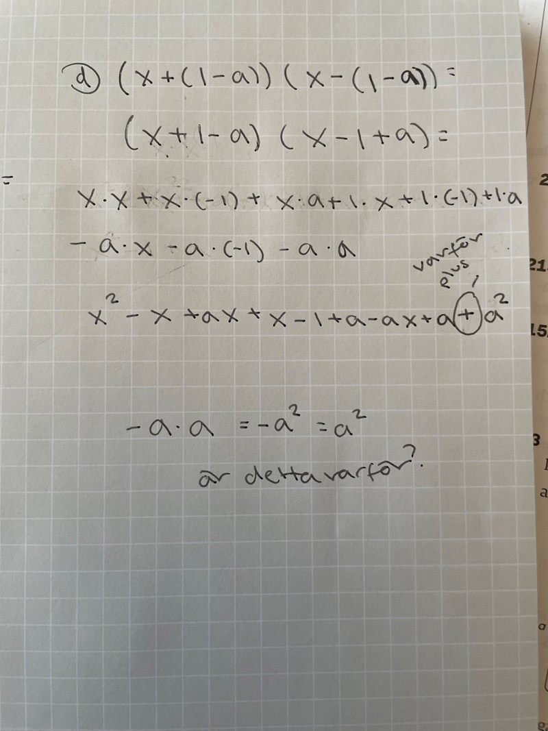 Hej! Jag kan inte lösa uppgift d) och skulle verkligen uppskatta hjälp! Varför kan man inte skriva -a^2, ränkas det som fel?