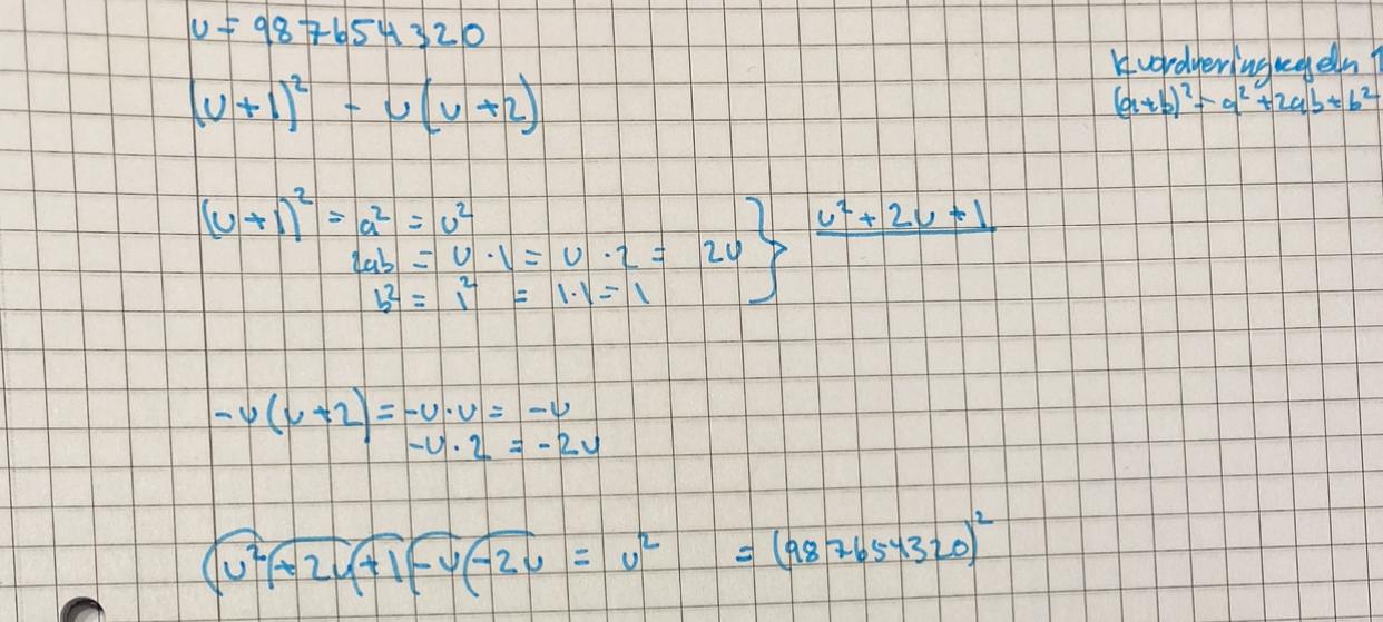 om 987654320=u, för att kunna förstå det hela så: (u+1)^2 vilket jag tolkar som: kvadreringsregeln 1 och får fram: u^2+2u+1.