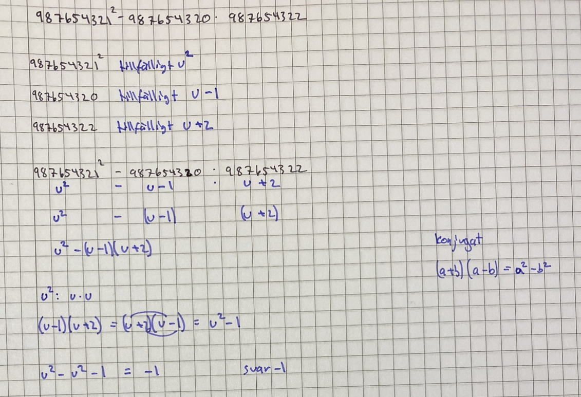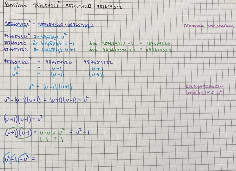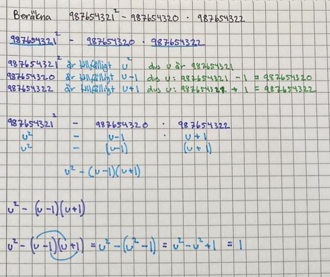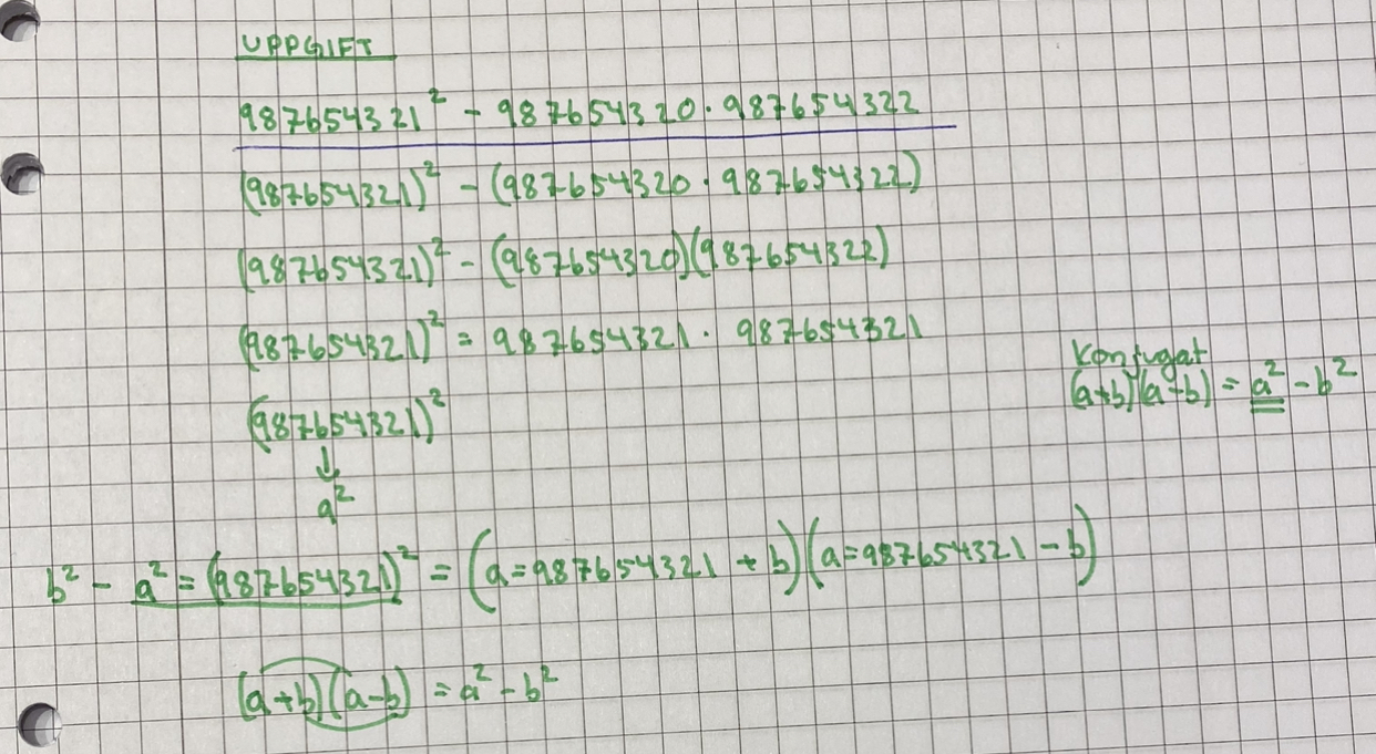 Eftersom att jag har 987654321 ^2 så tänker jag att jag kan använda mig av (a+b)(a-b)=a^2-b^2 för att få fram b^2, då a^2 är 987654321 ^2 vilket betyder att a i parenteserna är 987654321 i ena och 987654321 i andra, har jag tänkt rätt här?