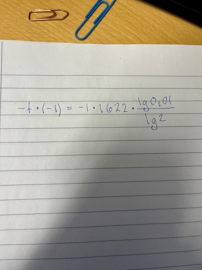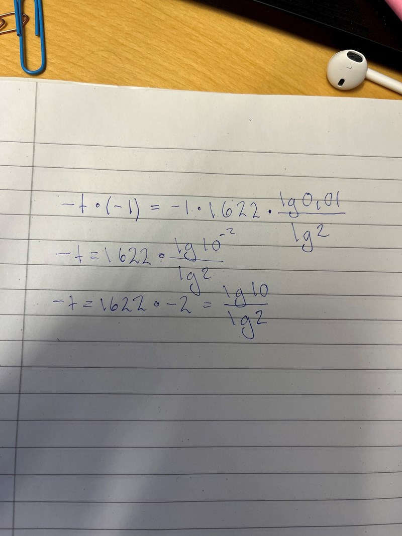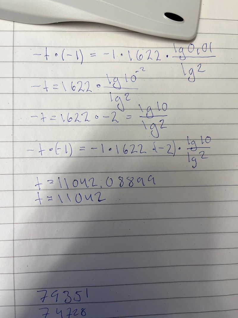 Om du ändå ska beräkna ett värde på t så skulle jag skippa de stegen vi gjorde med 0.01=10-2 och stoppa in det uttryck du har i inlägg #22 direkt. Har man inte miniräknare bör man dock förenkla det slutgiltiga uttrycket så långt som möjligt.