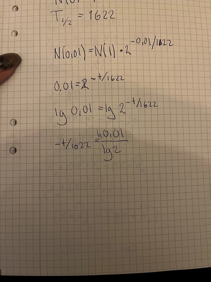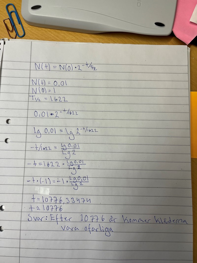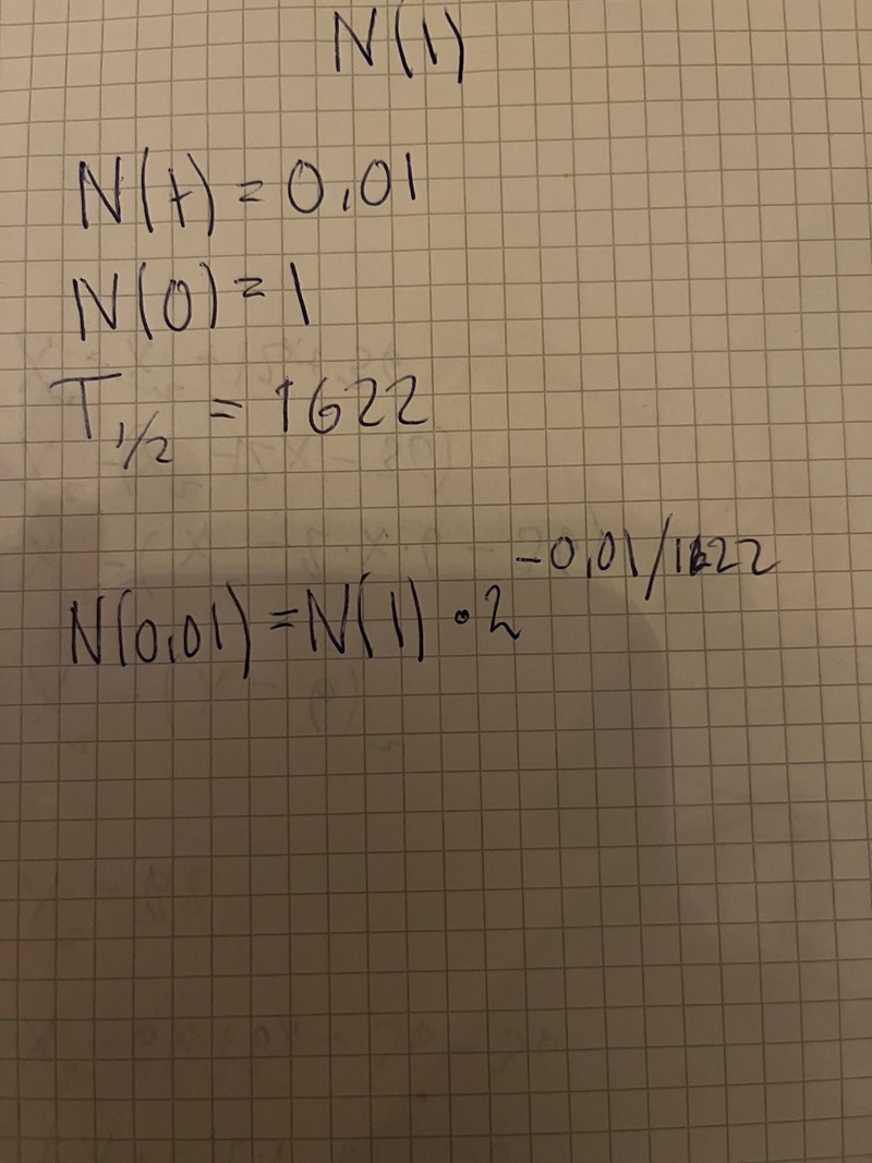 För att göra en sanity check på om den tiden vi kommit fram till är rimlig kan vi också undersöka hur många "halveringstider" det skulle ta att komma ner till 1% av det ursprungliga ämnet. Efter en halveringstid (1622 år) har vi 50% kvar, efter två halveringstider (2*1622 år) har vi 25% kvar. Hur många halveringstider krävs för att endast 1% ska vara kvar?