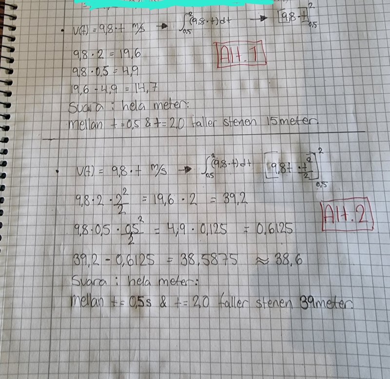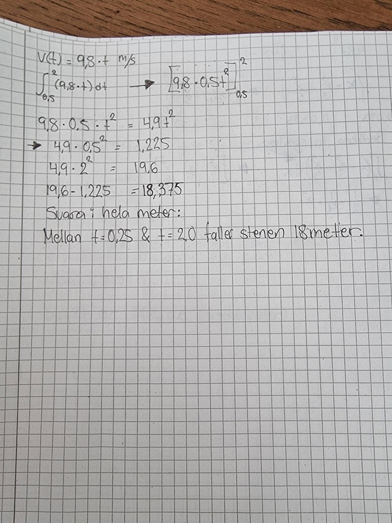 Hej jag skulle behöva hjälp med denna: Om man släpper en sten från en högt belägen plats får stenen en hastighet: 𝑣(𝑡) = 9,8 ∙ 𝑡 𝑚⁄ under de första sekunderna av fallet. Beräkna den sträcka som stenen 𝑠 faller från: 𝑡 = 0,5 𝑠 𝑡𝑖𝑙𝑙 𝑡 = 2,0 𝑠. Svara i hela meter. Tips: Sträckan kan beräknas med en integral.
