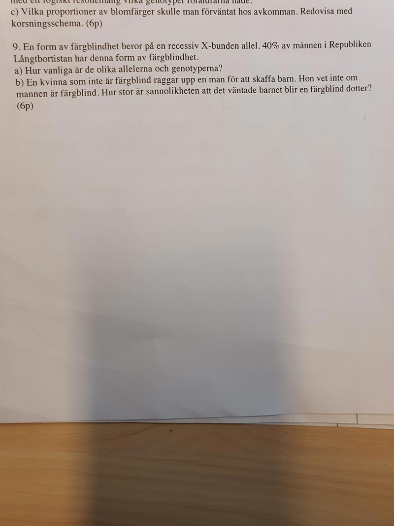 Med sannolikhet 4/7 är då kvinnan Ff (eller fF). Hon kan då få ett färgblint barn om snubben är färgblind (40 %).