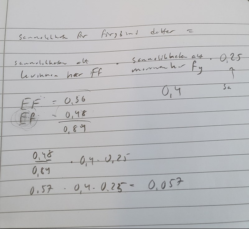 Av dessa 84 är 36 FF. Sannolikheten för FF givet inte ff är då 36/84 = 3/7.
