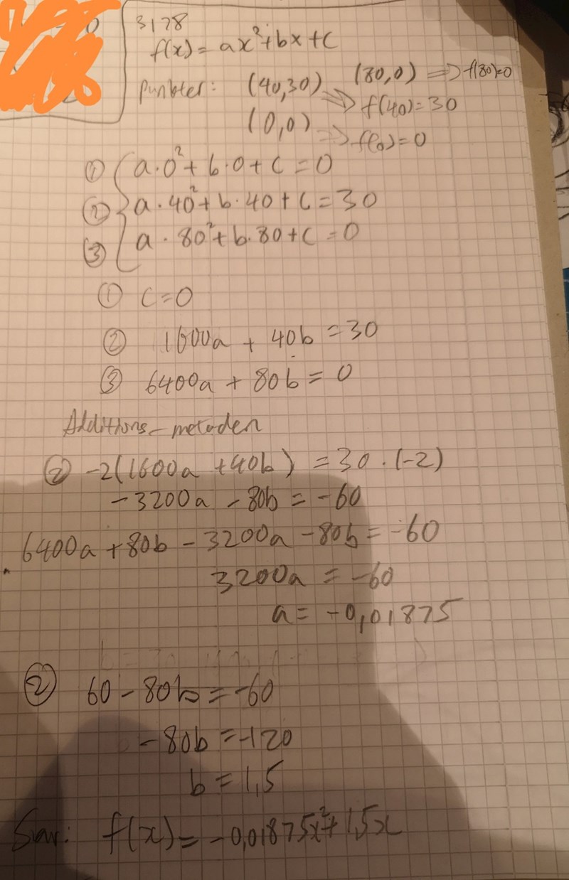 behöver hjälp med att kolla om jag har gjort fel eller rätt. Utifrån uppgift ska man skapa en funktionsuttryck med hjälp av dessa punkter: (0,0) (40,30) och (80,0).