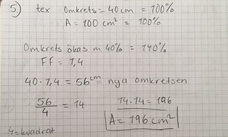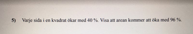 Smutstvätt skrev:Du har gjort rätt, men endast bevisat detta för ett fall. Om du kallar sidan s, och ökar den med 40%, hur lång är sidan? Hur stor blir arean? Genom att inte sätta ett specifikt tal som sidan, kan du bevisa påståendet för alla tal. :)