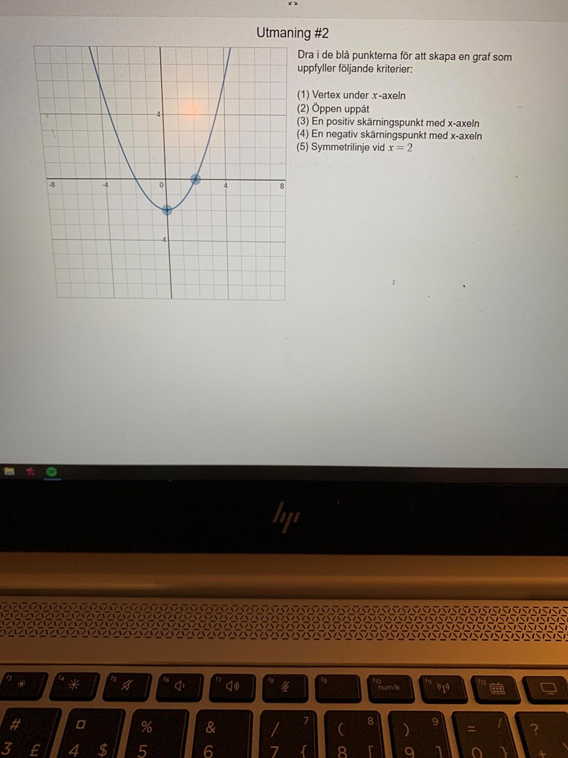 Om du drar en linje längs där x=2. Ser grafen då likadan ut på båda sidor om linjen? Se min röda linje nedan