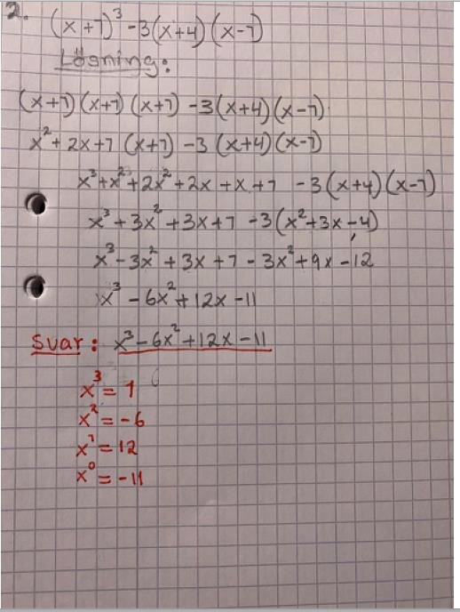 När det står , tänk på att det är ett negativt tal som multipliceras med varje term inuti parentesen, så plus blir minus och minus blir plus.