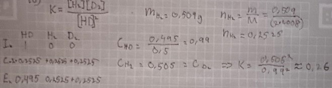 Jag får svaret K=0.26, då jag räknar ut koncentrationen för H2=D2 till 0.505 M och koncentrationen för HD till 0.99 M.
