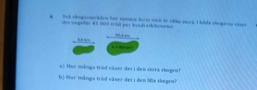 Du kan först beräkna antalet träd i den stora skogen genom att ta antalet träd per kvadratkilometer (45000) multiplicerat med arean av den stora skogen (), inte längden 50,4 km som du har gjort. Det går 45000 träd per kvadratkilometer, så för att beräkna antalet träd i skogen ska vi multiplicera med skogens yta i kvadratkilometer, inte längden 50,4 km.