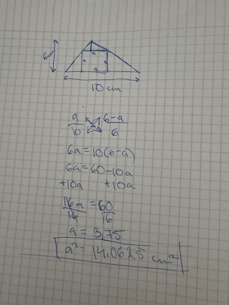 stötte på följande fråga häromdagen där man skulle räkna ut arean på kvadraten bara med hjälp av den stora triangelns bas och höjd, har försökt rita upp bilden men den är självklart inte identisk med den ritnings bilden. Huvudsaken är att topptriangeln är likformig med den stora triangeln. Hur skulle ni lösa den?