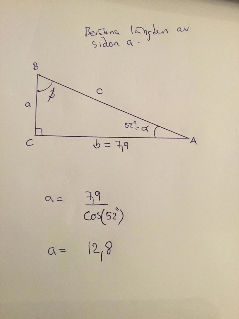 Nej, du tänker fel. Du ska bestämma en katet med känd andra katet och känd vinkel.