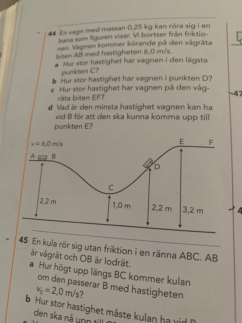 Ture skrev:Höjdskillnaden är 1 meter mellan B och E, så rörelseenergin vid B måste vara minst 1*mg för att vagnen ska orka till E, där m är vagnens massa och g är 9,82.