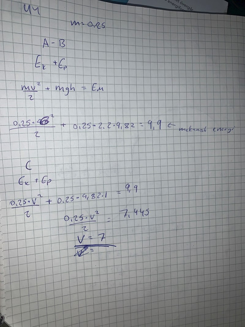 Hej! Så jag har jobbat med denna uppgiften men jag är inte säker på om jag har använt rätt metod. Från punkt A till B så finns det en potentiell och kinetisk energi. Så den mekaniska energin där blir 9,9. På punkt C så finns det också både en potentiell och mekanisk energi, och jag tog summorna = den mekaniska energin som vi räknade ut från början.