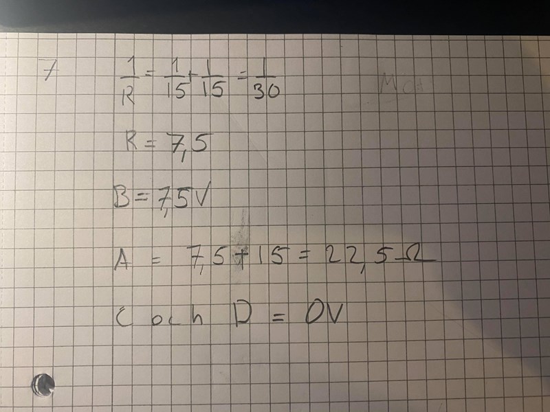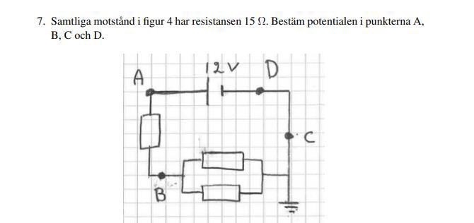 Du har räknat ut att ersättningsresistansen för de parallellkopplade motstånden är , d v s hälften så stor som det ensamma motståndet. Detta medför att spänningen över dessa är hälften så stor som spänningen över det ensamma motståndet. U+½U = 12 V (= batterispänningen). Kommer du vidare?
