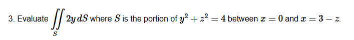 Uppgiften säger att "SS is the portion of y2+z2=4y^2 + z^2 = 4 ..." och man ska beräkna S\iint_S.
