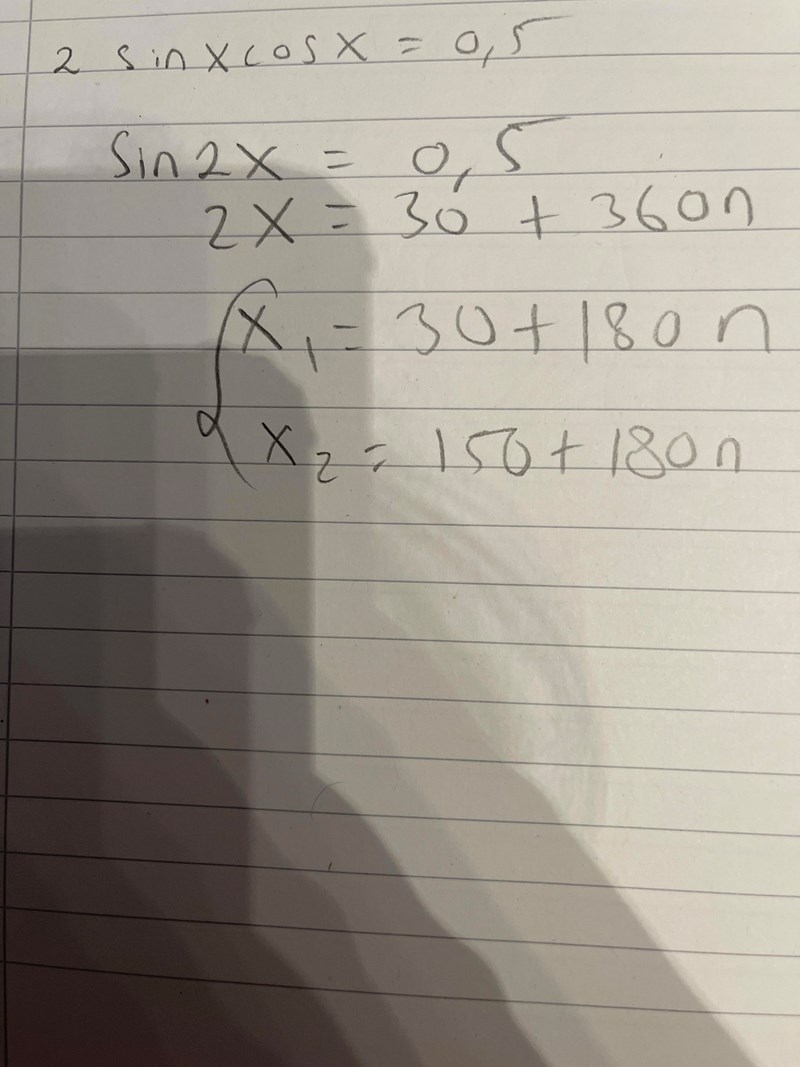 Kontrollera att dessa vinklar uppfyller ekvationen 2sin(x)cos(x) = 0,5
