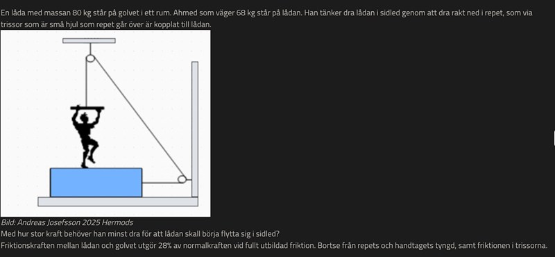 Jag tror att jag måste ta både Ahmeds massa + lådans massa för att få den totala massan då Ahmed står på lådan (är osäker). Därför får jag friktionskraften till:
