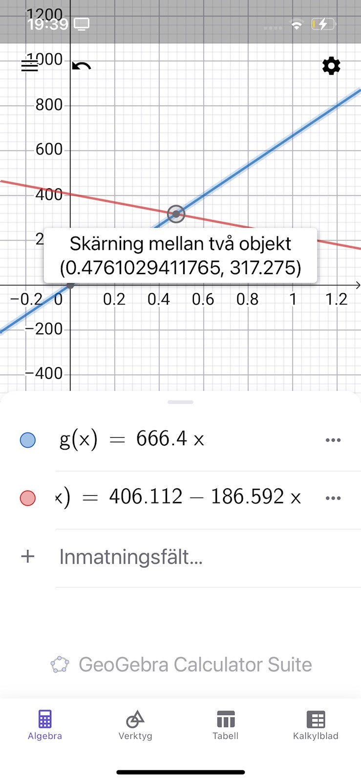 sen gör jag 2 grafer o kollar skärningspunkten, eller försvårar jag det för mig själv nu? Finns det en annan lösning? Har jag ens löst rätt?