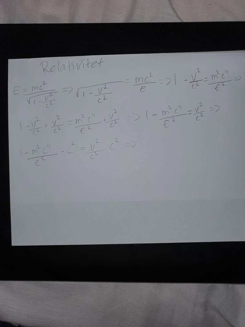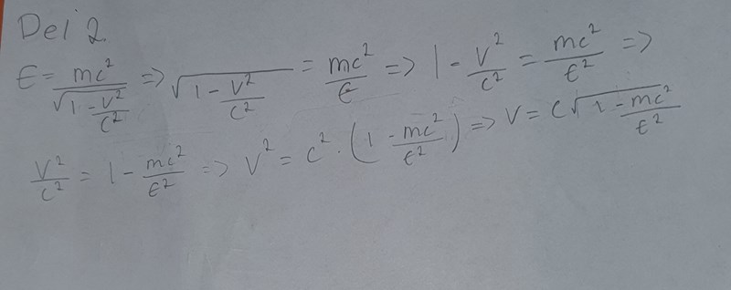 Jag har riktigt svårt för att förstå vad svaret blir när jag multiplicerar c^2 med (1-m^2c^4÷E^2). Sen bör jag väl ta bort c^2 från högerleden och ta kvadratroten ur v^2 så att jag får v ensamt ?
