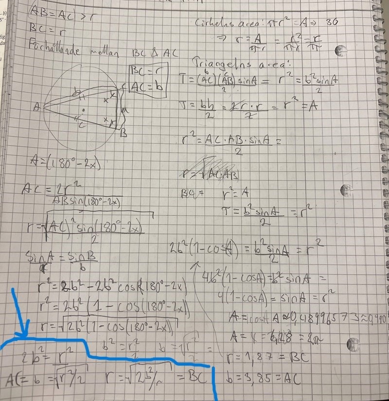 Längden BC har jag skrivit som r medan längden AC har jag kallat för B. Jag vet att AC = AB eftersom den är en liksidig triangel och jag inser att ett fel jag gjort nu när jag tänker efter är att jag räknat höjden av triangeln för 2r vilket är därför jag fick fel svar
