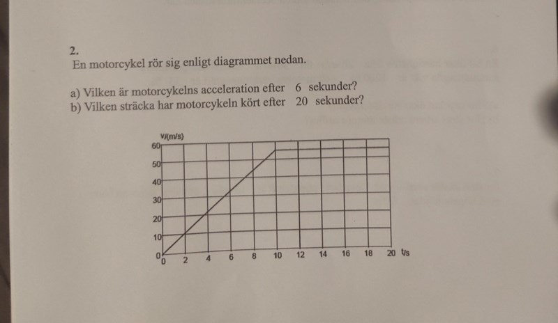 Laguna skrev:Diagrammet visar hastigheten. Efter 10 s är hastigheten 55 m/s. Efter 20 s är hastigheten fortfarande 55 m/s. Du ska räkna ut sträckan.