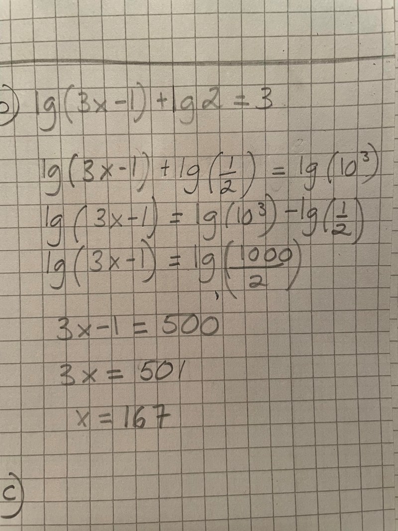På rad 4 ersatte du lg(10^3) - lg(1/2) med lg(1000/2). Det är inte samma sak.