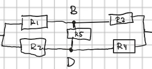 Det blir RBD = R5 // (R1+R2) // (R3+R4).