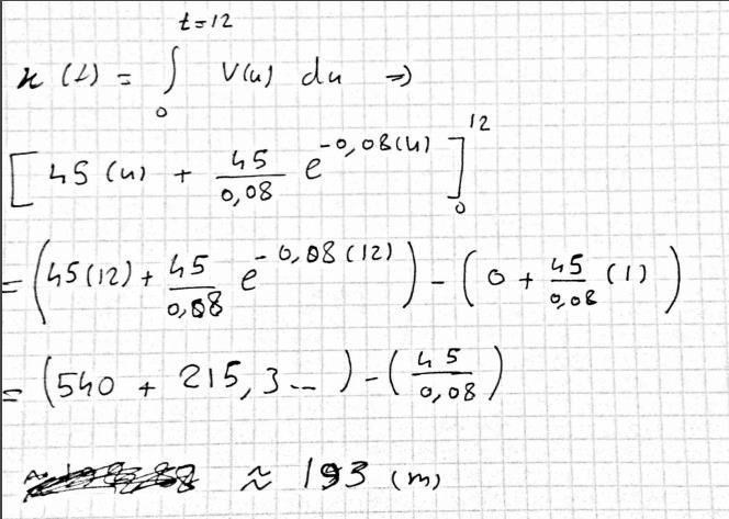 Om det är min kommentar om att det inte bör vara 45 framför e^(-0.08t) så läs ditt ursprungliga inlägg, där står det att v(t)=45(1 - 45e-0.08t), men det rödmarkerade 45 ska väl inte vara där?