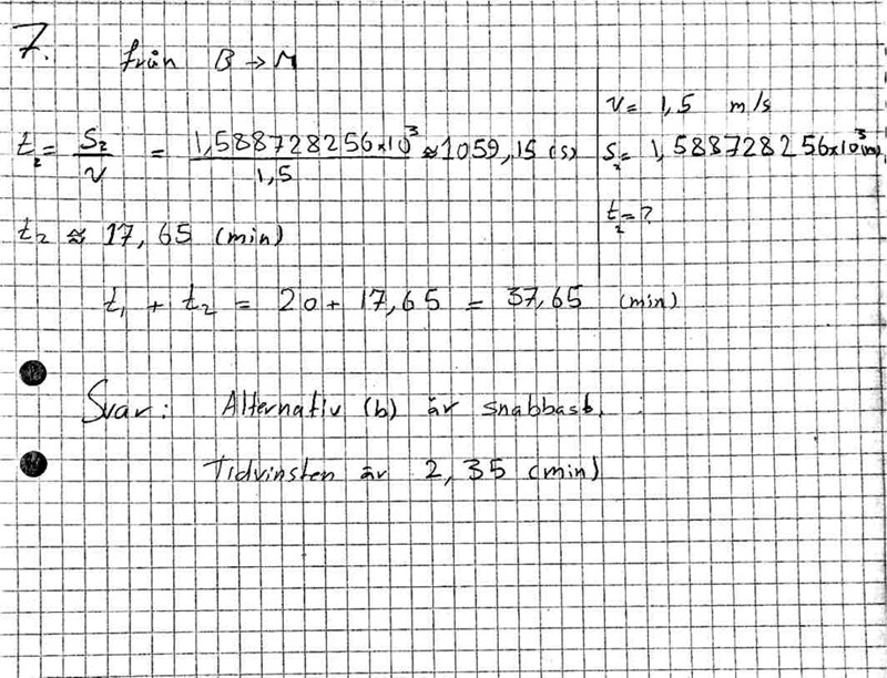 Jag har räknat på det och fick att alternativ b är snabbare och tidvinsten är 2,35 min.