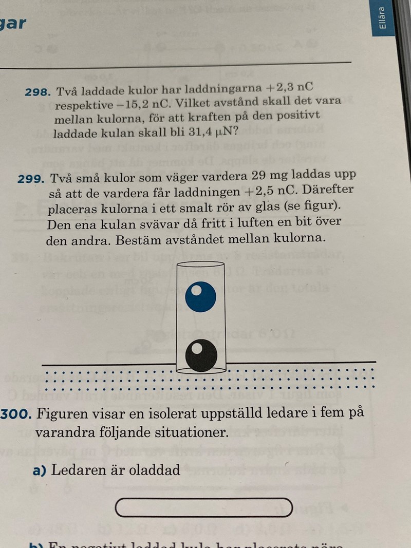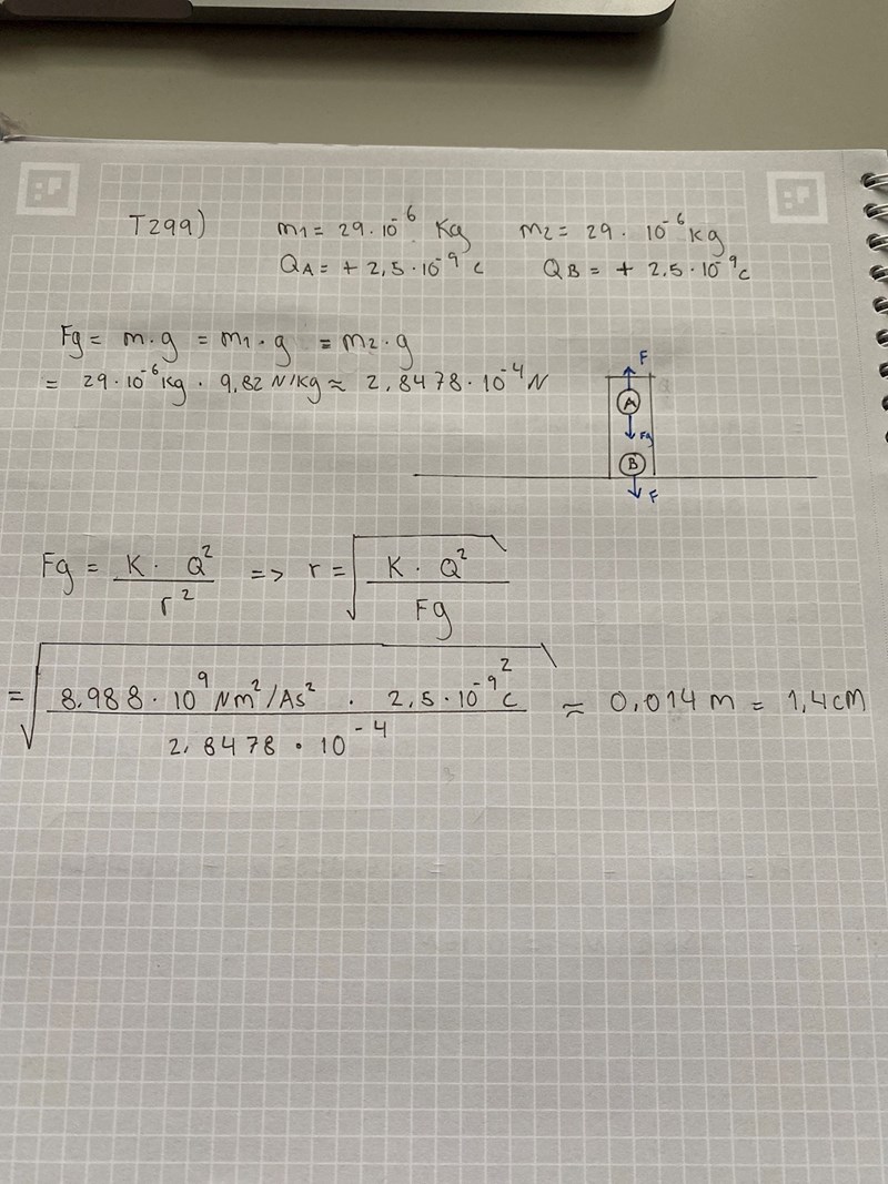 Kraftresultanten för vardera kula =0. Om Fq är den elektriska kraften gäller: